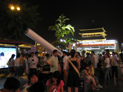 The big white pipe looking thing is actually a telescope that a guy moves around the city so that people can then pay to look through. He seemed to attract a lot of attention and business.